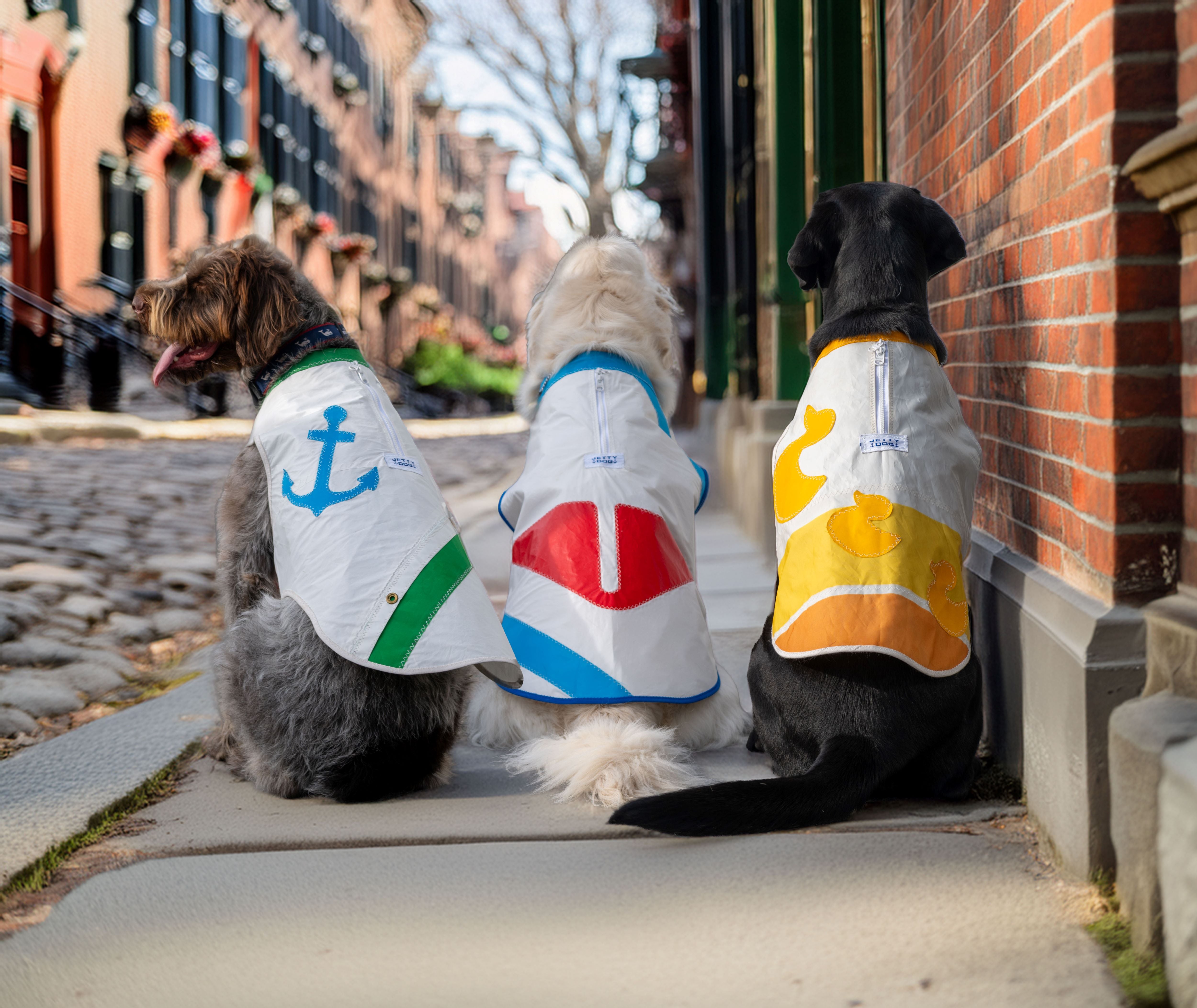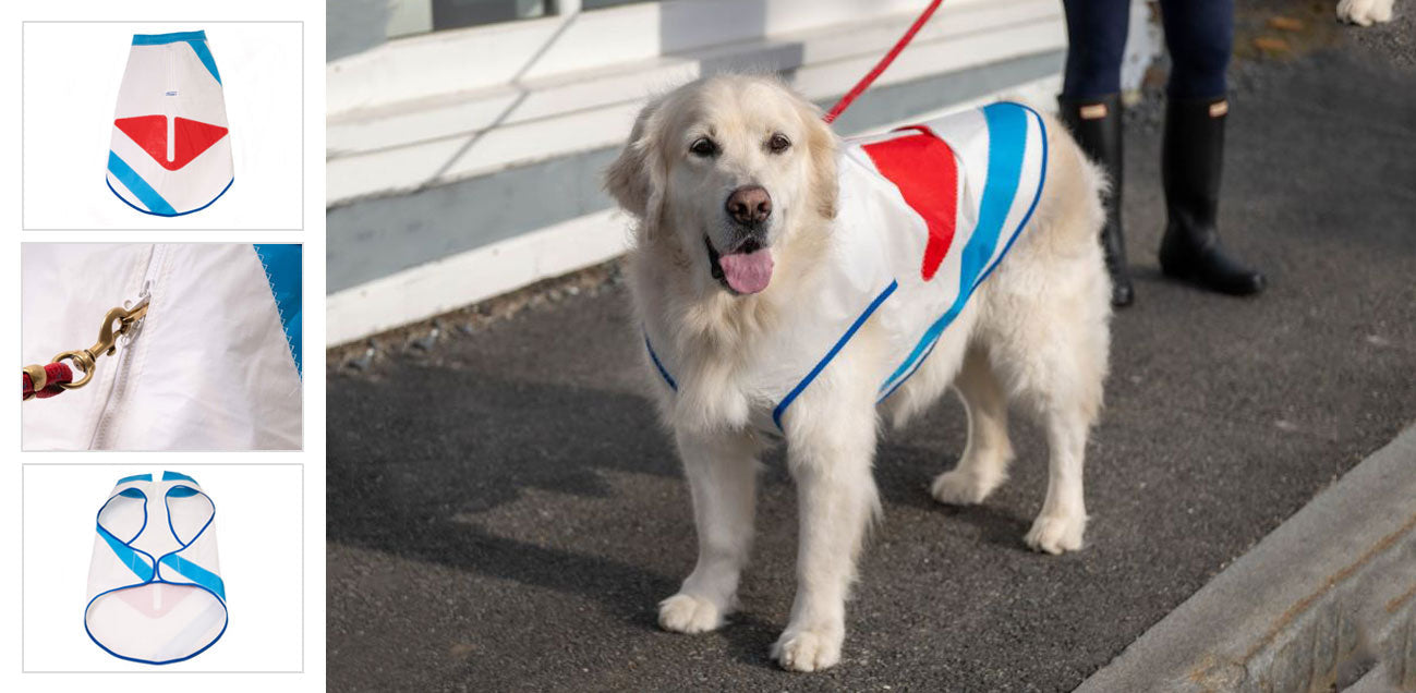 Playful, nautical themed raincoats to keep your pup dry when it’s raining cats and dogs! Made out of recycled and upcycled sails, these custom raincoats feature a unique pattern with contrast stitching, a 2-way zipper for collar/harness access and adjustable closure to accommodate varying chest sizes.